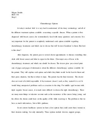 La inmunoterapia es una opción de tratamiento relativamente nueva y, aunque todavía no ha sido aprobada por la Administración de Alimentos y Medicamentos (FDA) para el cáncer de mama, es un área prometedora. La inmunoterapia funciona elevando las defensas naturales del cuerpo para combatir el cáncer. Tiene menos efectos secundarios que la quimioterapia y es menos probable que cause resistencia. Pembrolizumab es un inhibidor del punto de control inmunitario. Es un tipo de inmunoterapia que se ha mostrado particularmente prometedora en el tratamiento del cáncer de mama metastásico. Actúa bloqueando anticuerpos específicos que dificultan que el sistema inmunitario combata el cáncer. Esto permite que el cuerpo se defienda de manera más eficiente. Un estudio de 2016 encontró que el 37,5% de los pacientes con cáncer de mama triple negativo vieron un beneficio de la terapia. Debido a que la inmunoterapia aún no está aprobada por la FDA, el tratamiento está disponible principalmente a través de ensayos clínicos en este momento. Tratamientos complementarios y alternativos Algunas personas con cáncer de mama pueden estar interesadas en explorar tratamientos complementarios o alternativos como vitaminas, hierbas, acupuntura y masajes. Estos tratamientos se utilizan junto con las terapias tradicionales contra el cáncer de mama para tratar el cáncer o aliviar los síntomas del cáncer y los efectos secundarios incómodos de tratamientos como la quimioterapia.